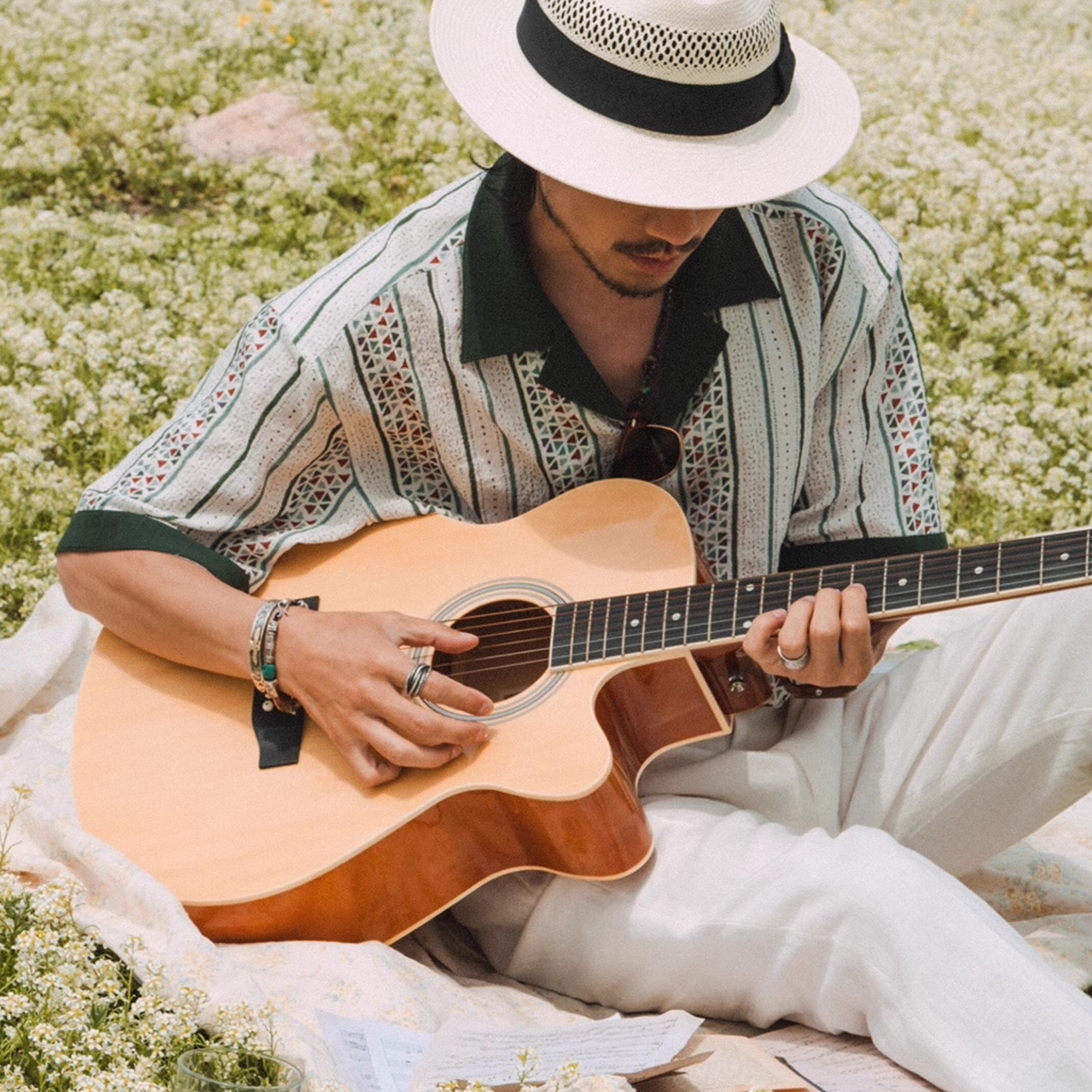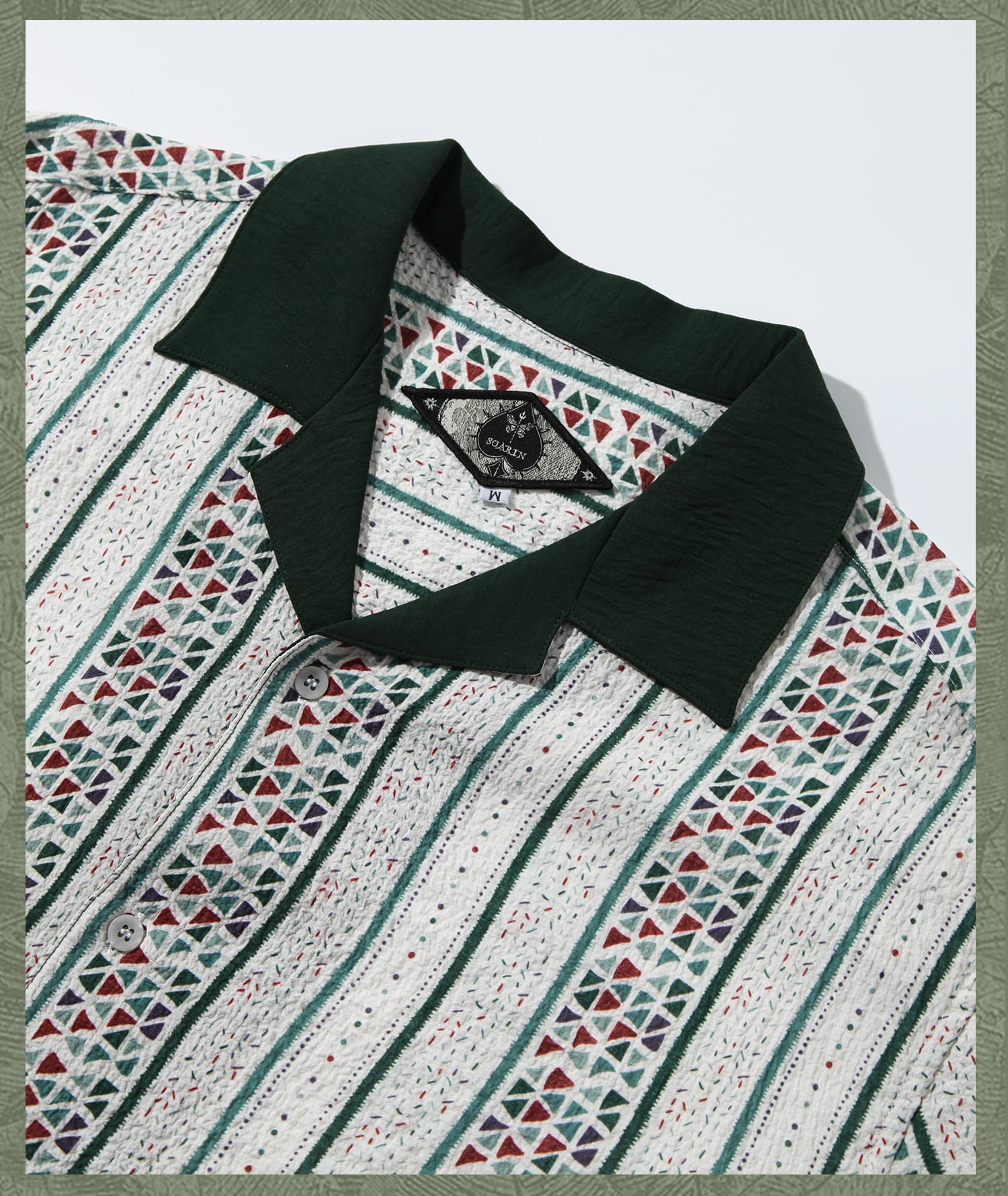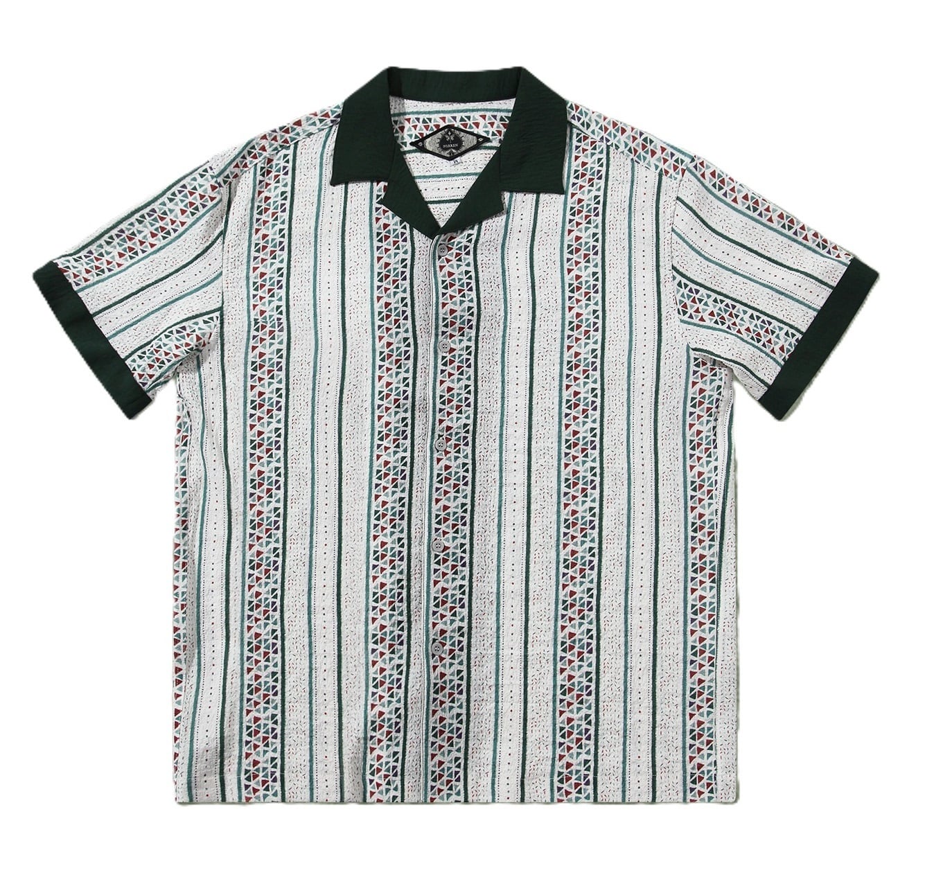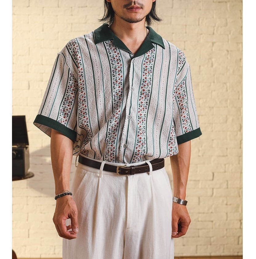 今季注目の幾何学模様を大胆に取り入れた、半袖オープンカラーシャツ。