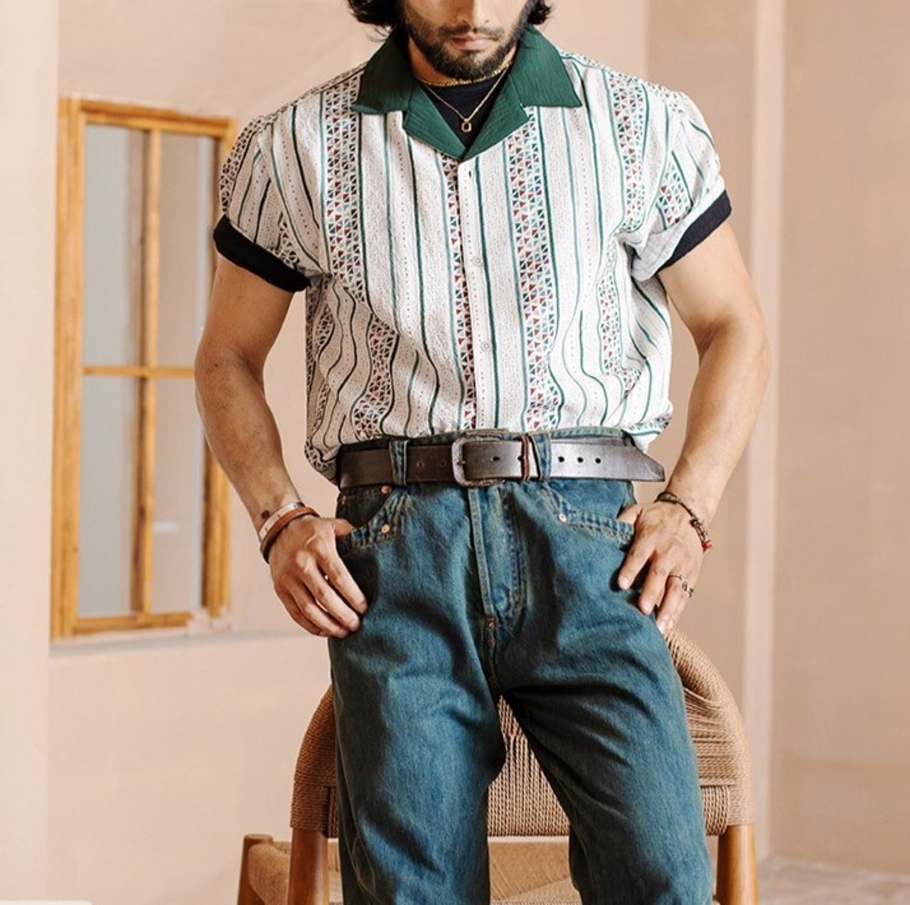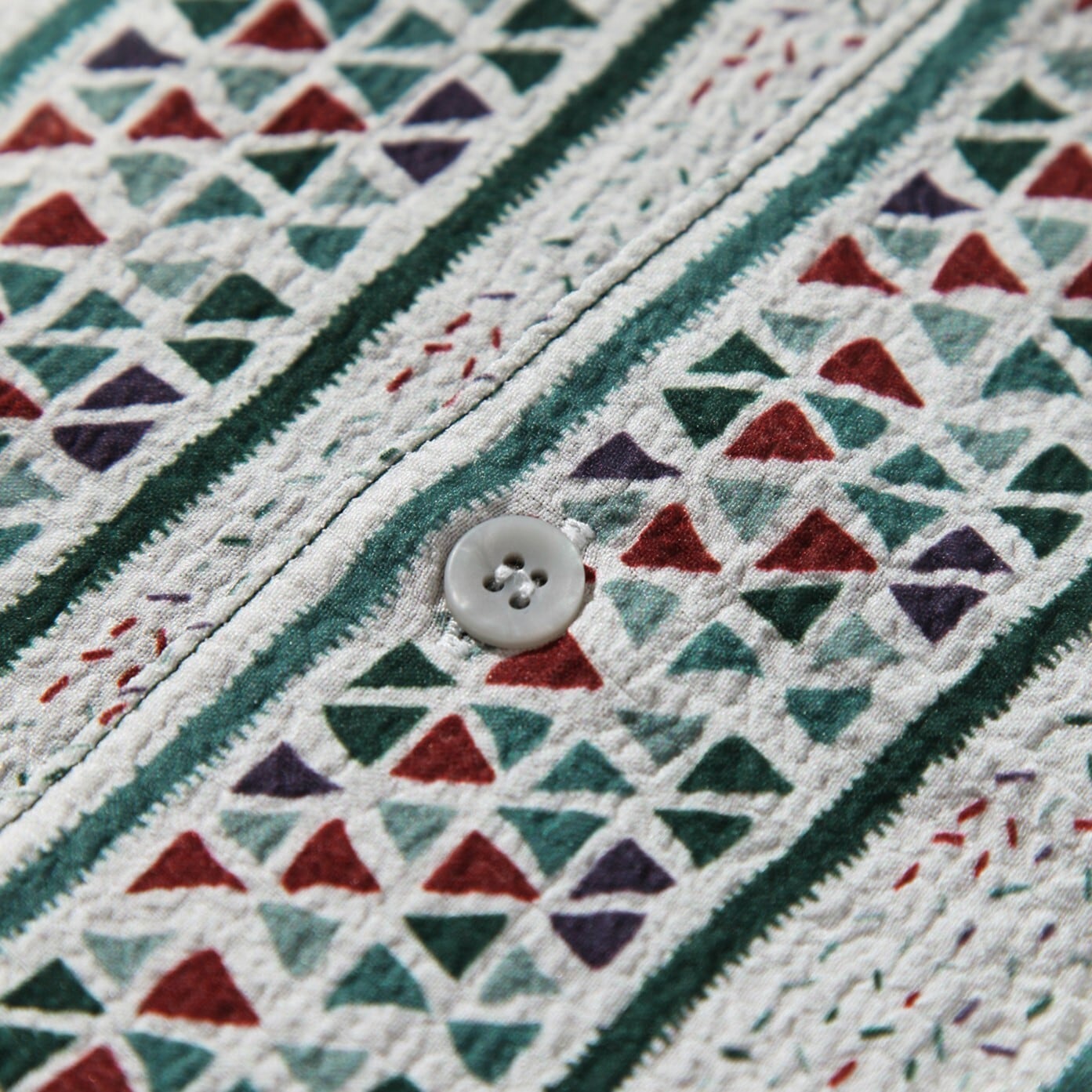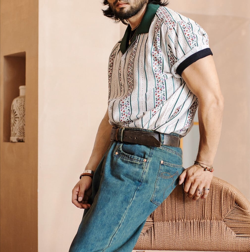 定番のストライプ柄に、遊び心のある幾何学模様が織りなす絶妙なバランスが、着こなしにこなれた雰囲気をプラスします。