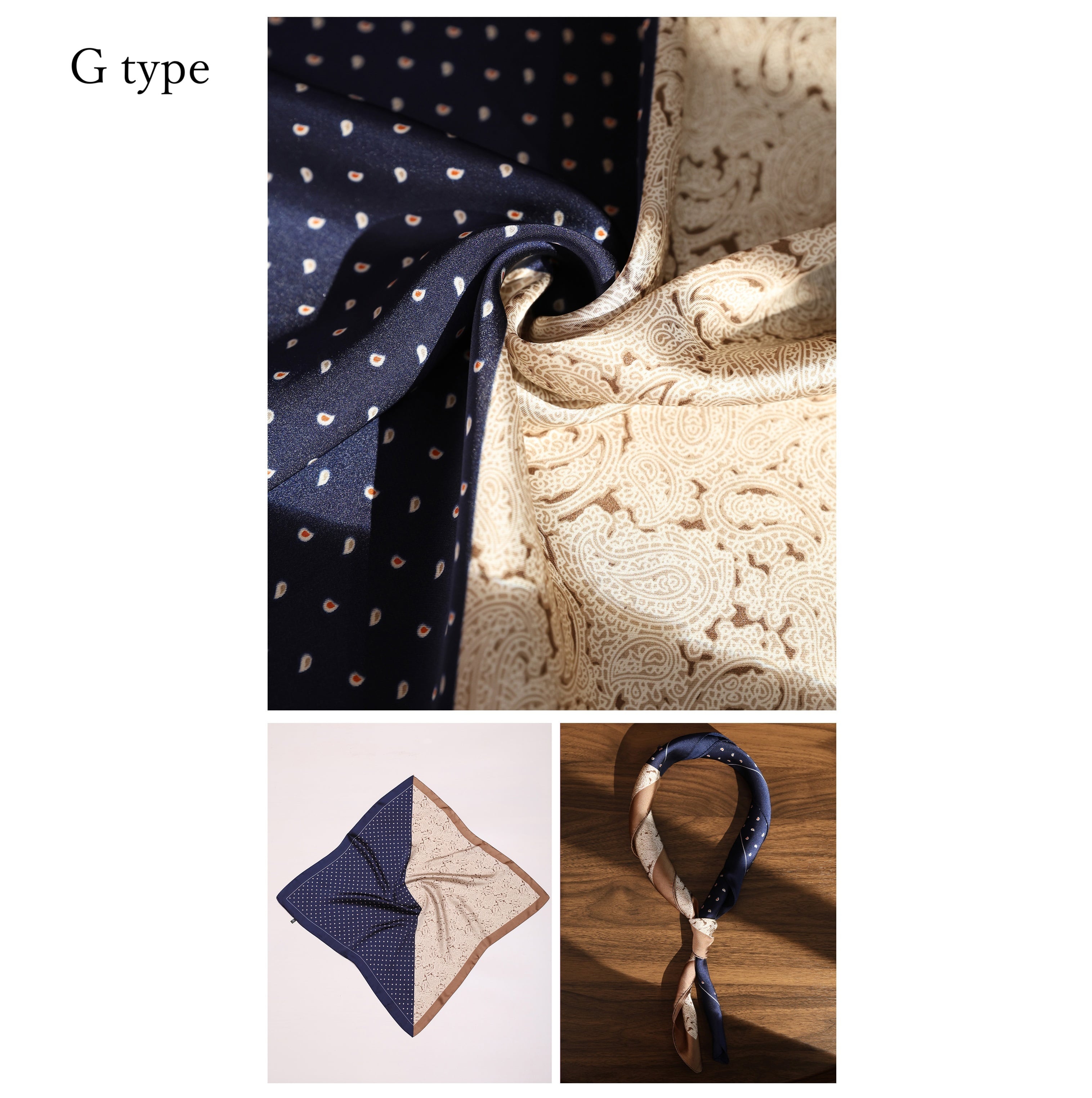 落ち着いた色合いの疑似シルクスクエアスカーフ。