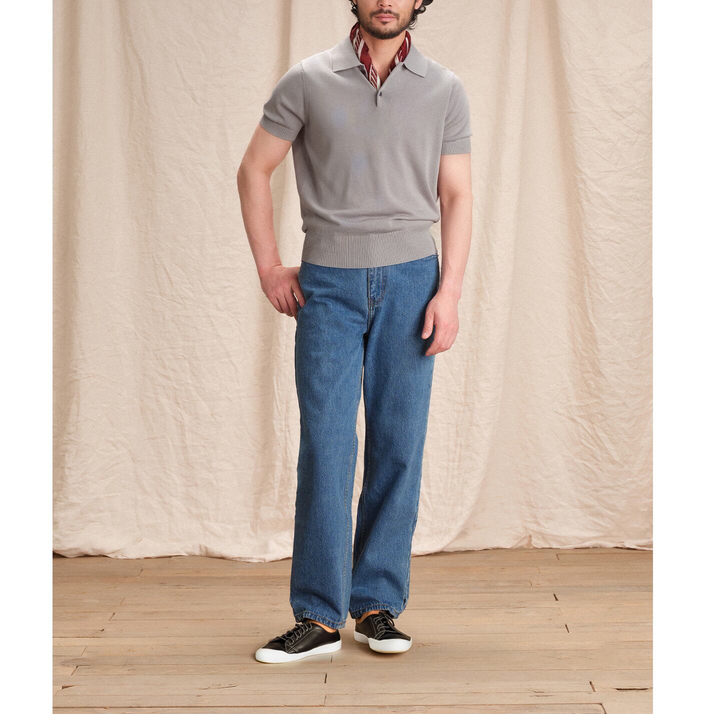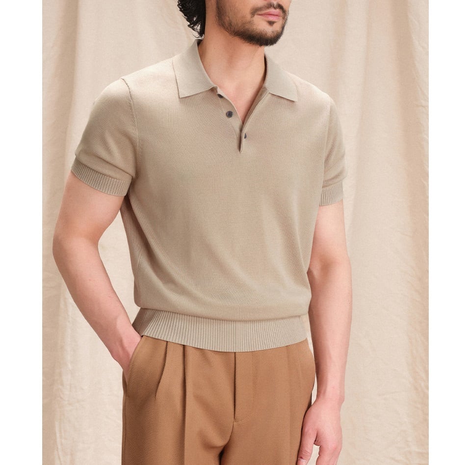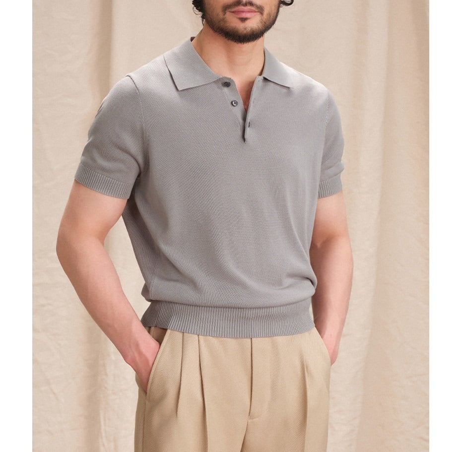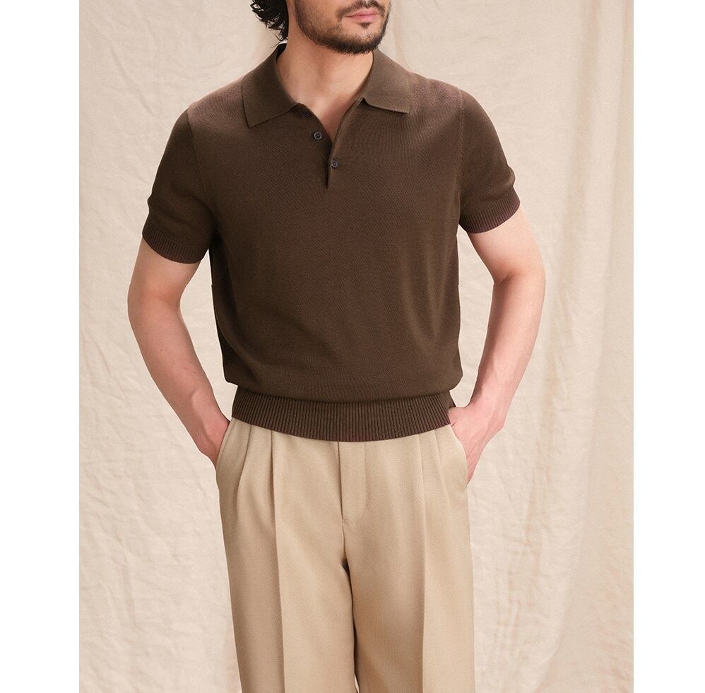 すっきりとしたシルエットに、クラシックなポロカラーとリブ編みのディテールが特徴で、ビジネスにもカジュアルにも。