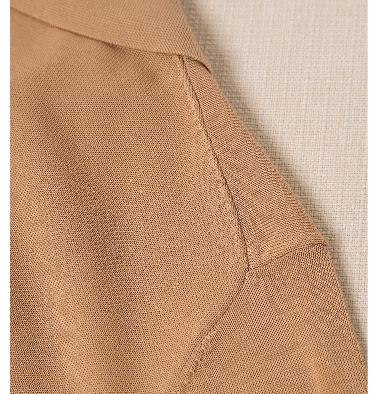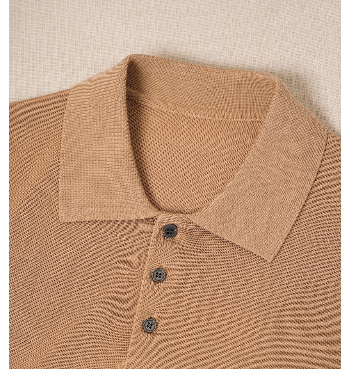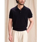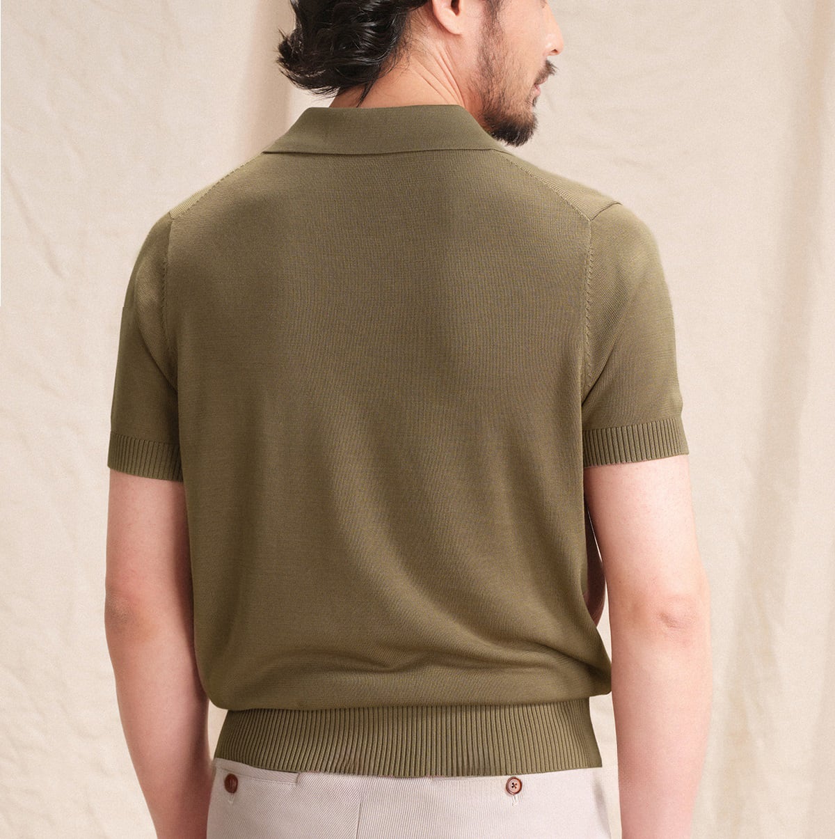 すっきりとしたシルエットに、クラシックなポロカラーとリブ編みのディテールが特徴で、ビジネスにもカジュアルにも。