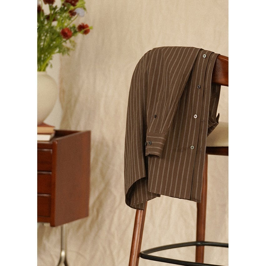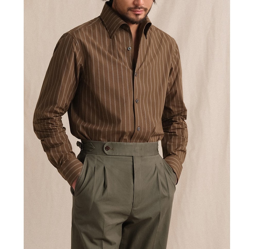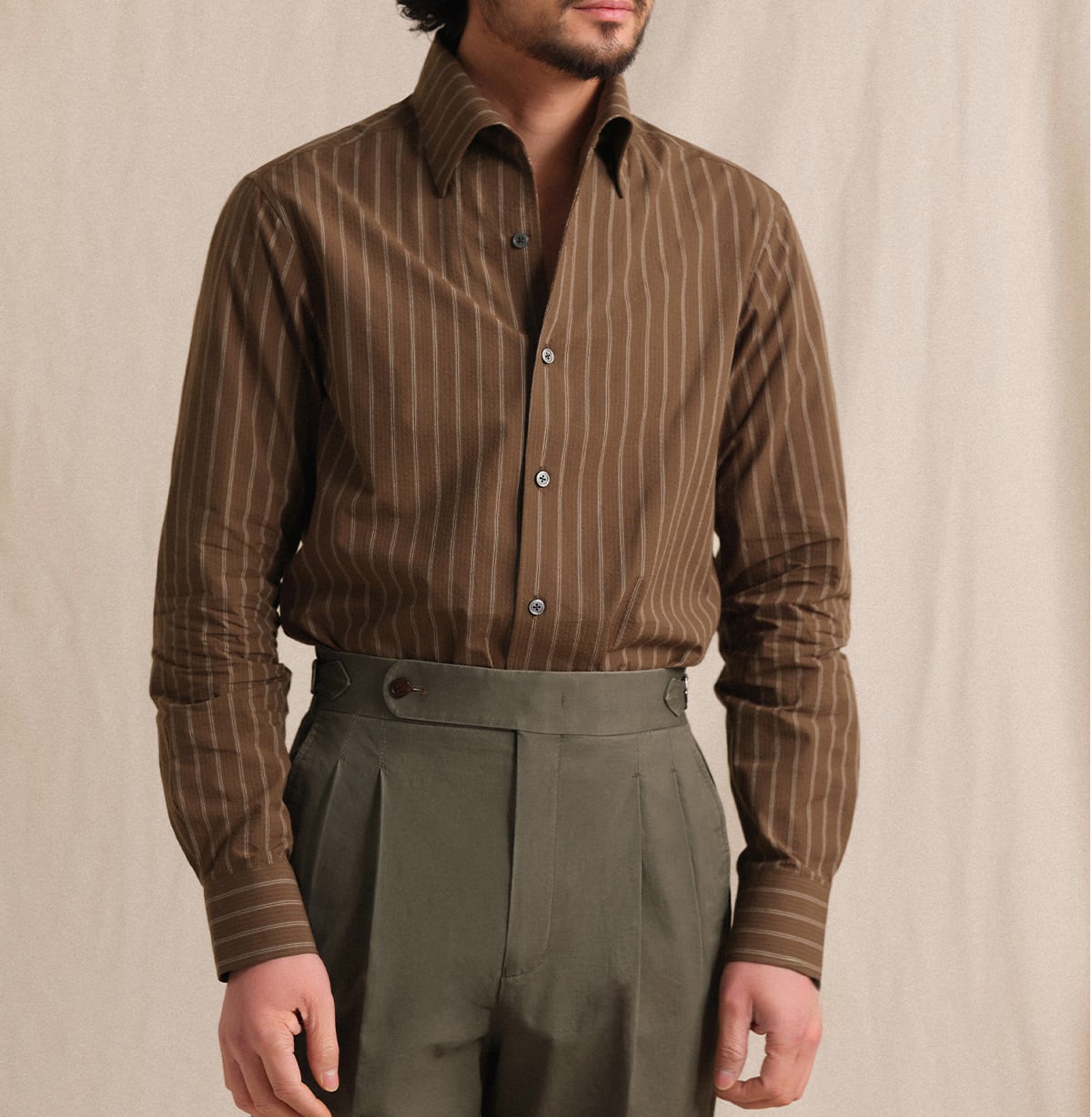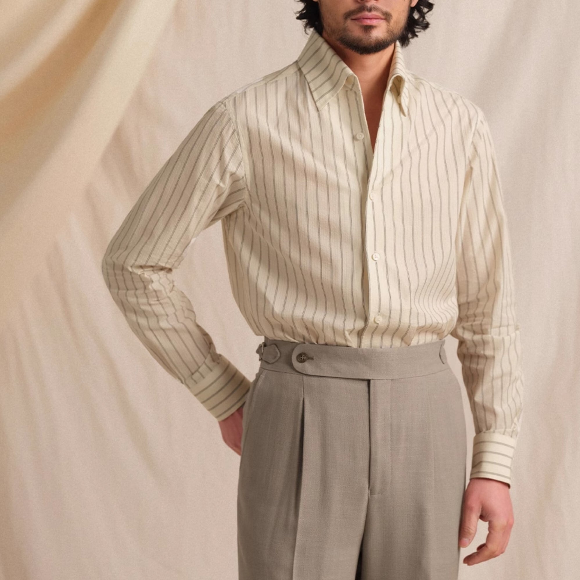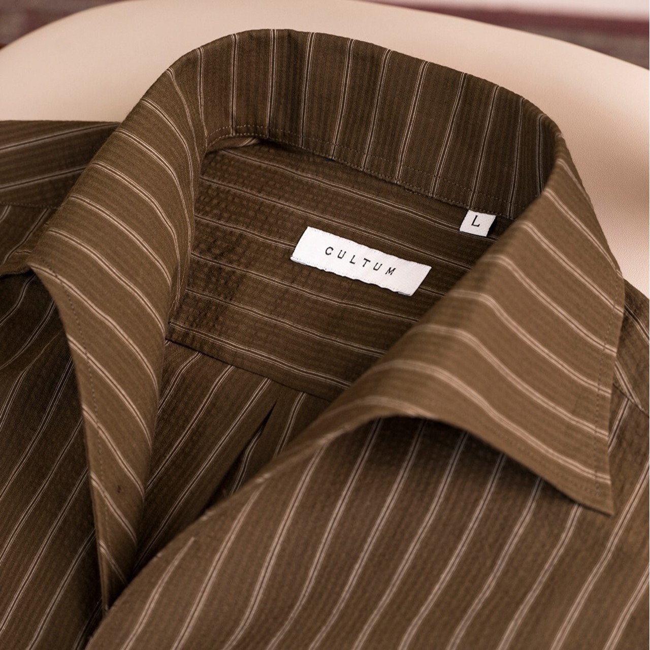 立体的な襟元の美しいシルエットが際立つストライプ柄シャツ。