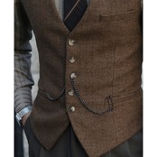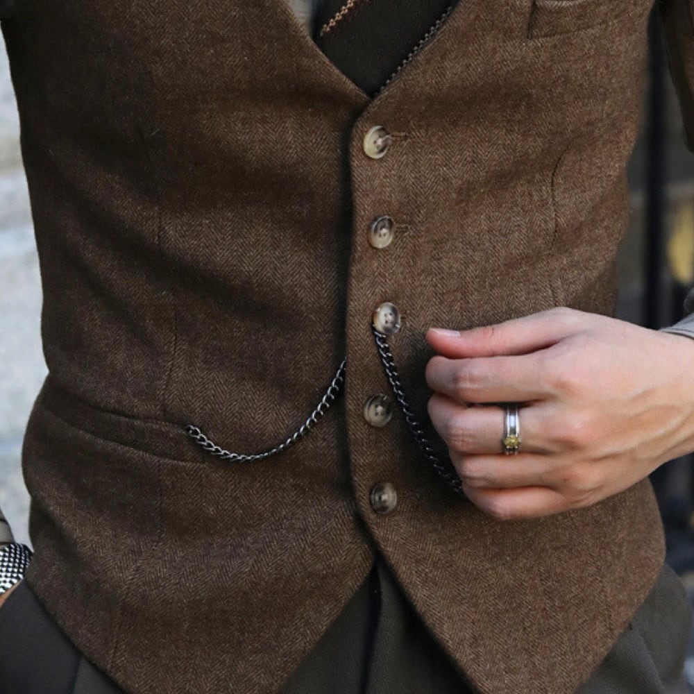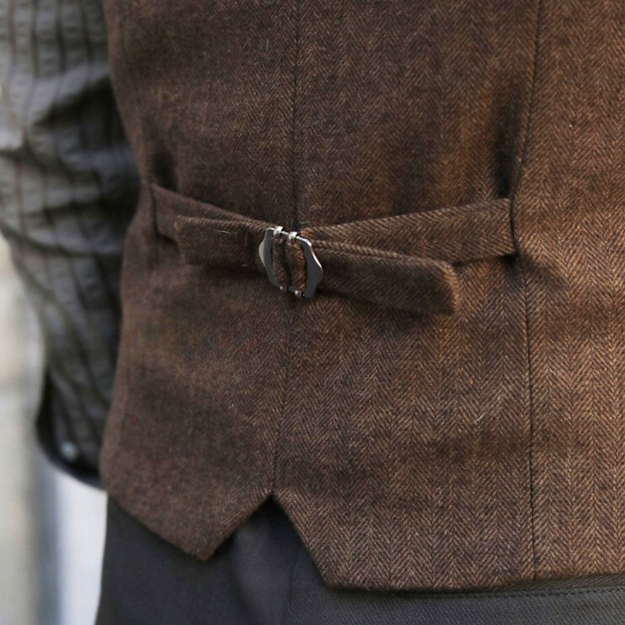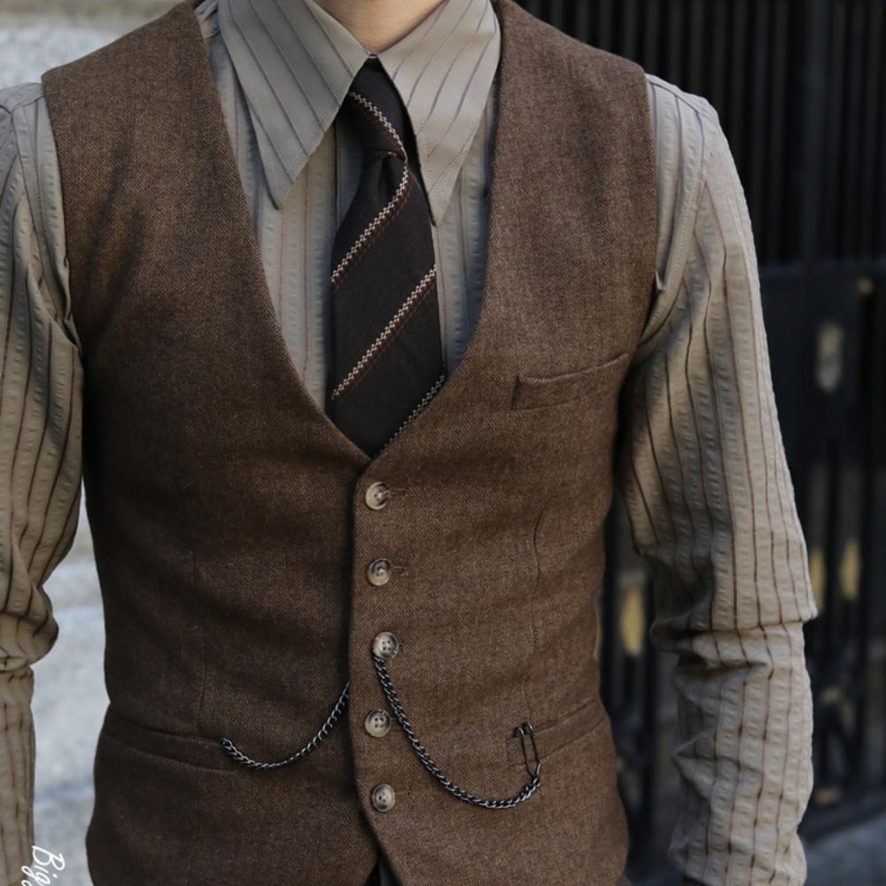 スタイリッシュなウールツィードのベストは、シンプルな装いに奥行きを与えるのに最適です。